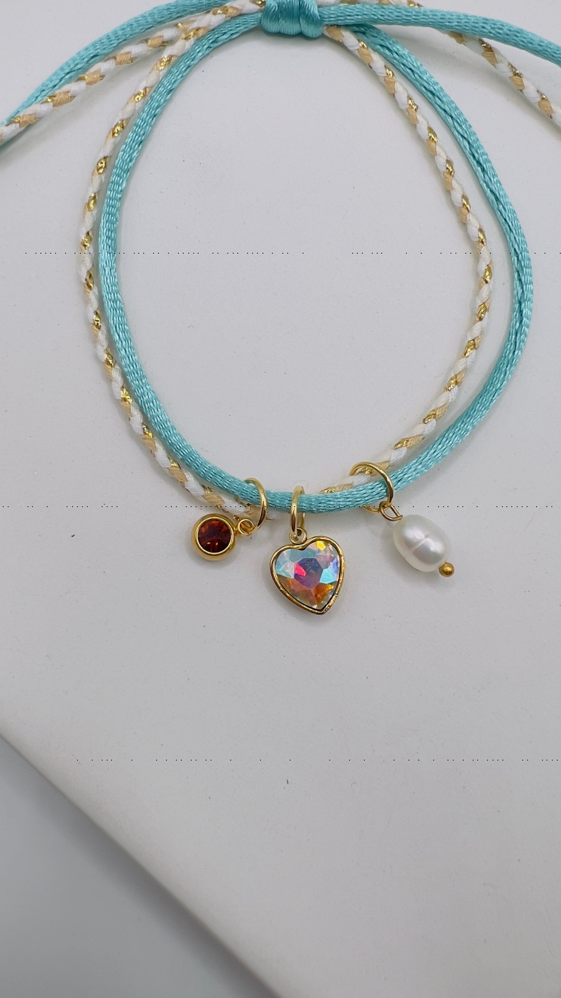 Pulsera ajustable con dijes en acero inoxidable y una perla.