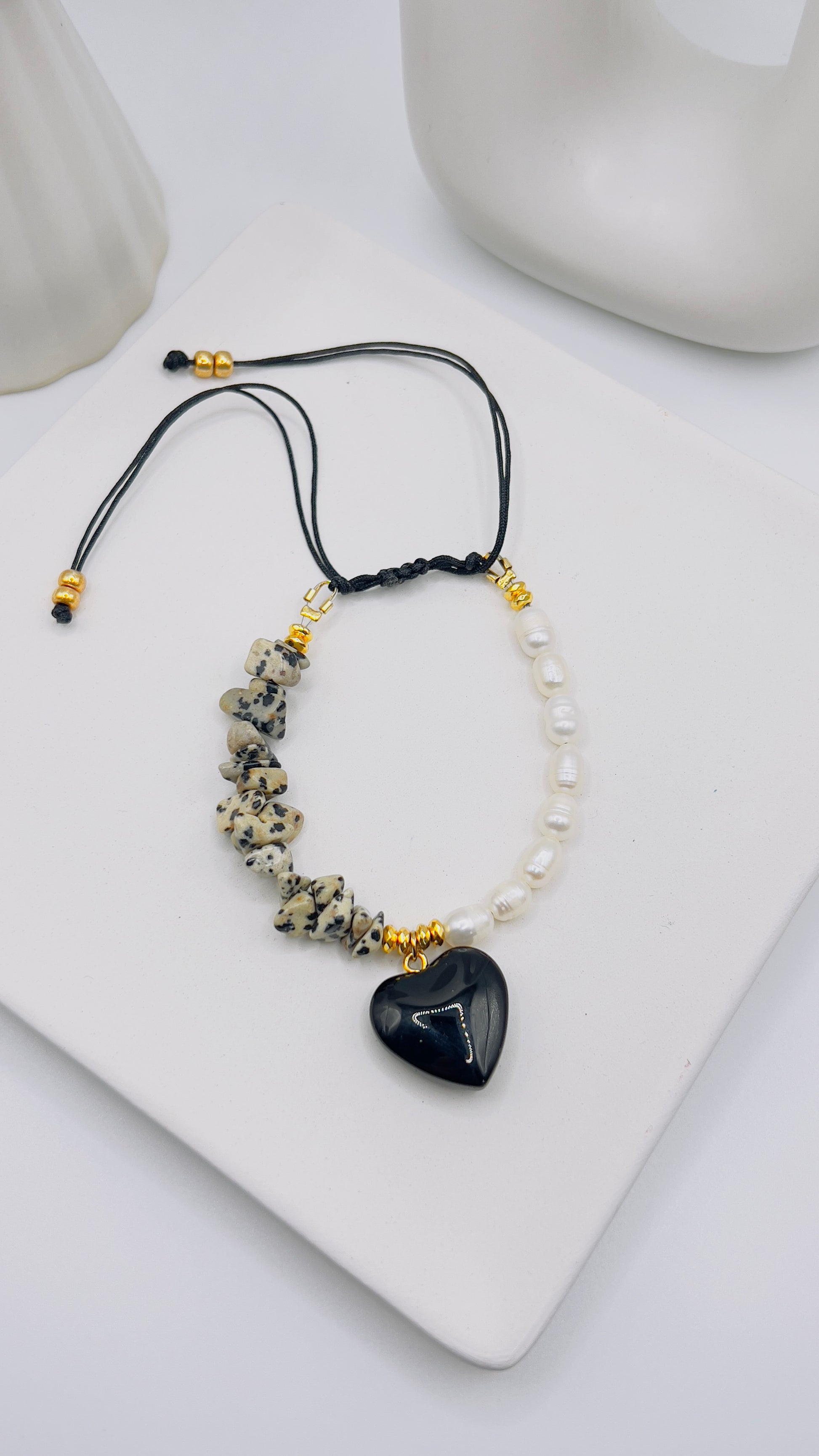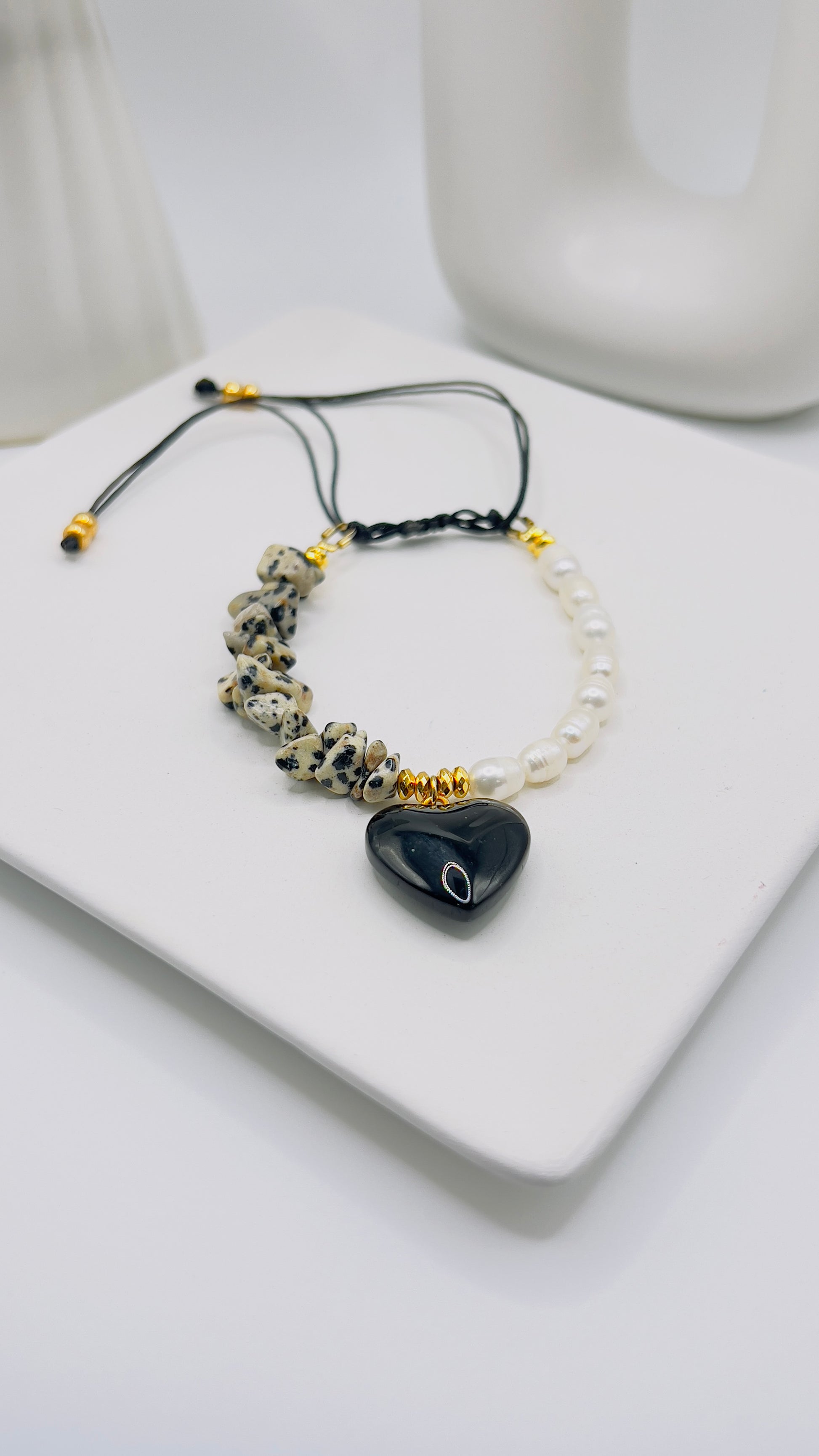 Pulsera ajustable en una combinacion de perlas y piedras crema con machita negras, detalles en dorado.