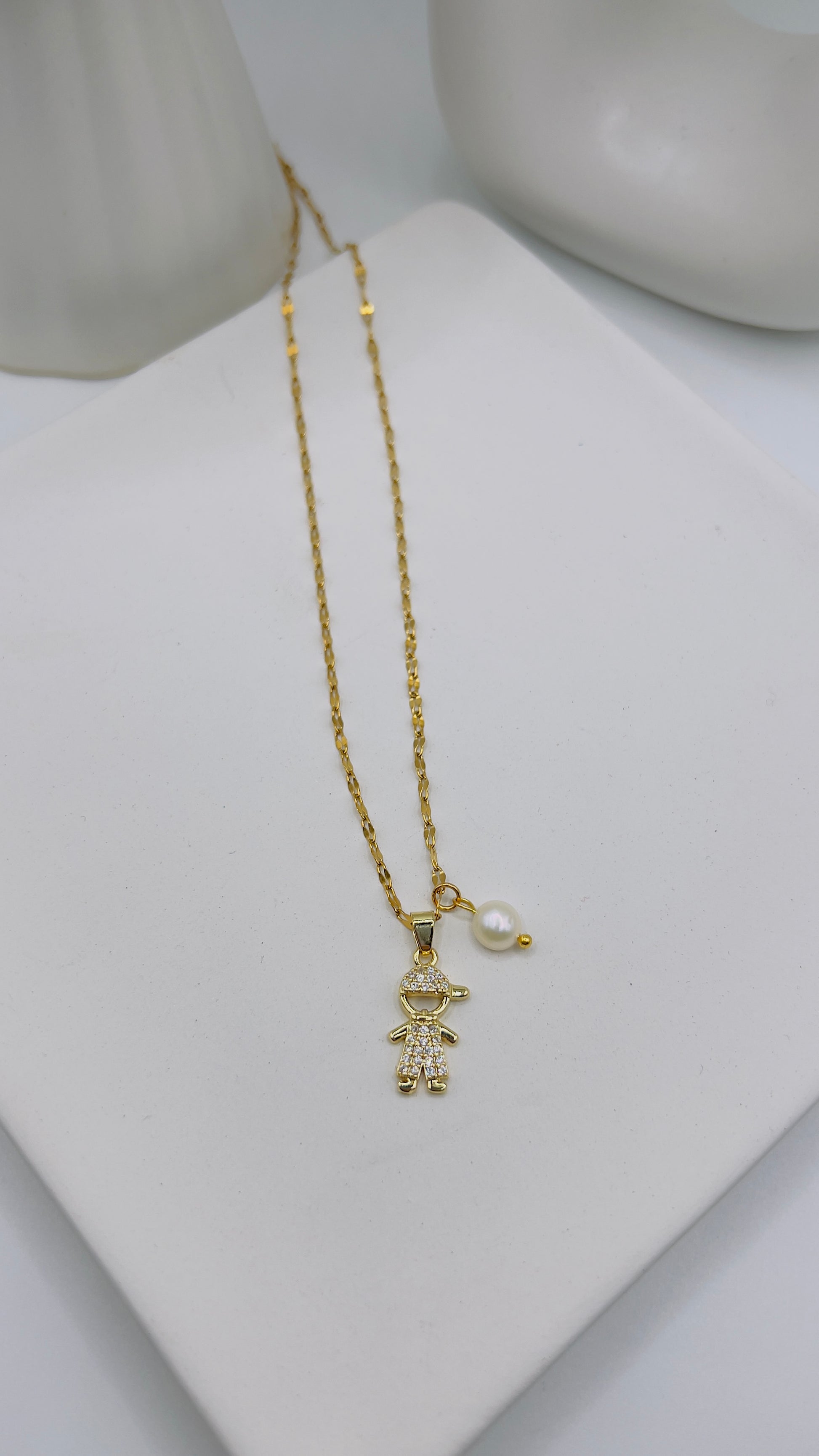 Cadena y charm en cobre con detalle de una perla.